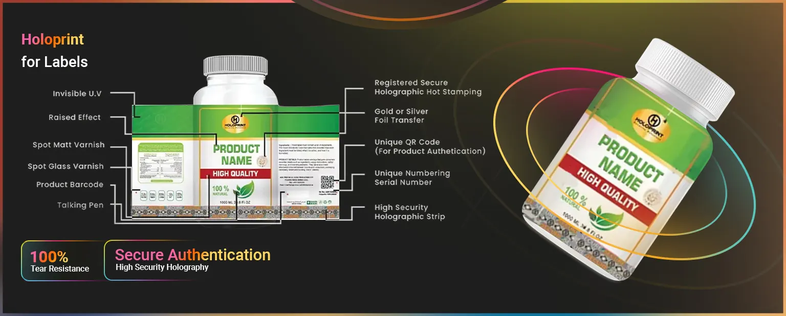 Holoprint offers advanced label solutions that combine design flexibility with cutting-edge security features. Our labels ensure product authenticity, featuring tamper-evident technology and QR code integration. Customizable to meet your branding needs.Protect your brand and enhance consumer trust with Holoprint’s secure and innovative labels.